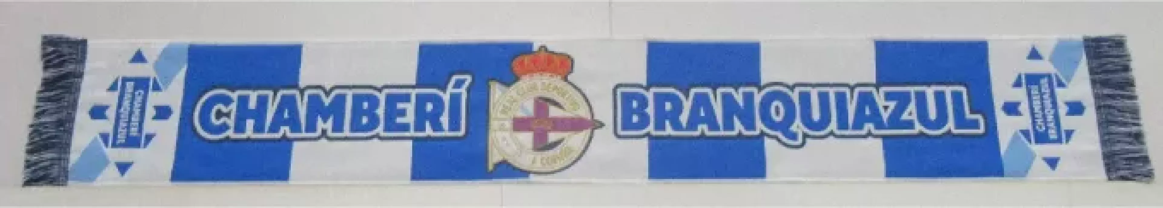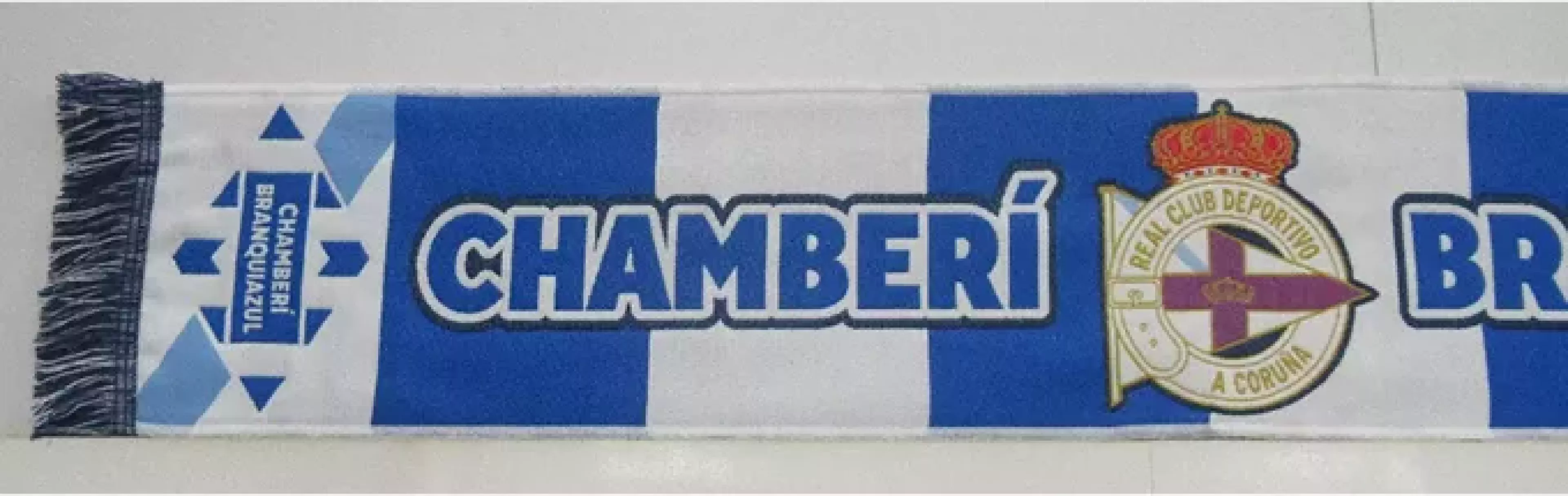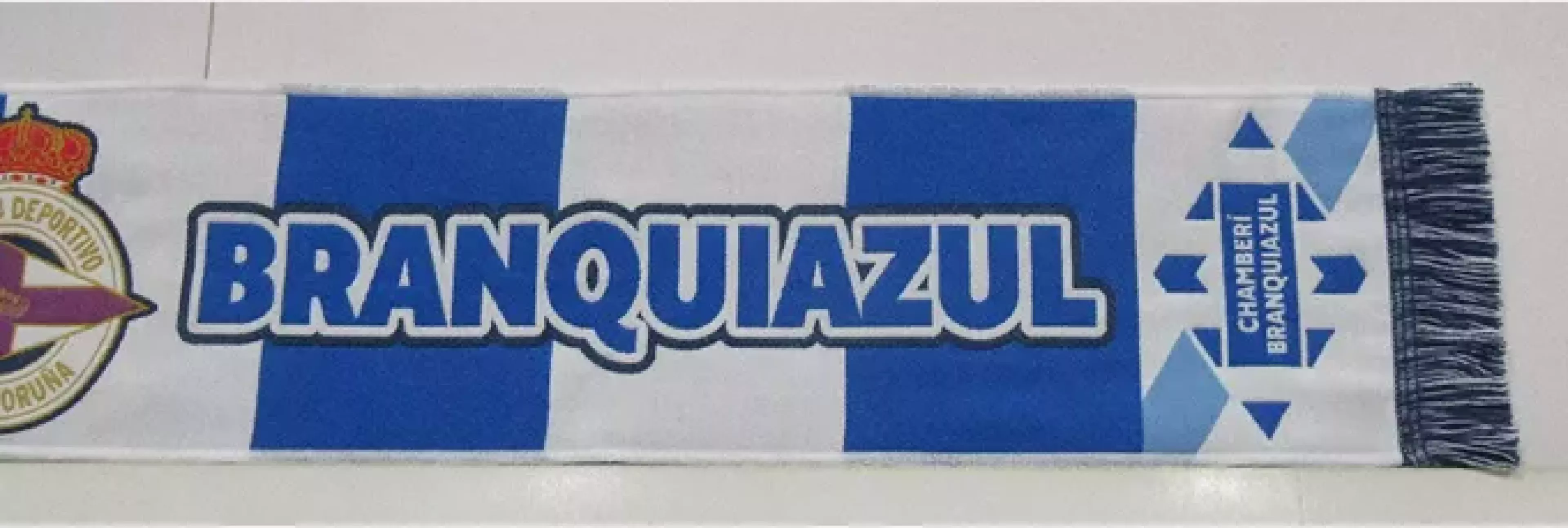 En este caso, el diseño fue aportado por el cliente con flecos en contraposición, con los colores del club, naranja, blanco y azul marino, lo que se convirtió en nuestro catálogo de hilos en blanco, azul olímpico y naranja tanto para flecos como para el cuerpo de la bufanda.